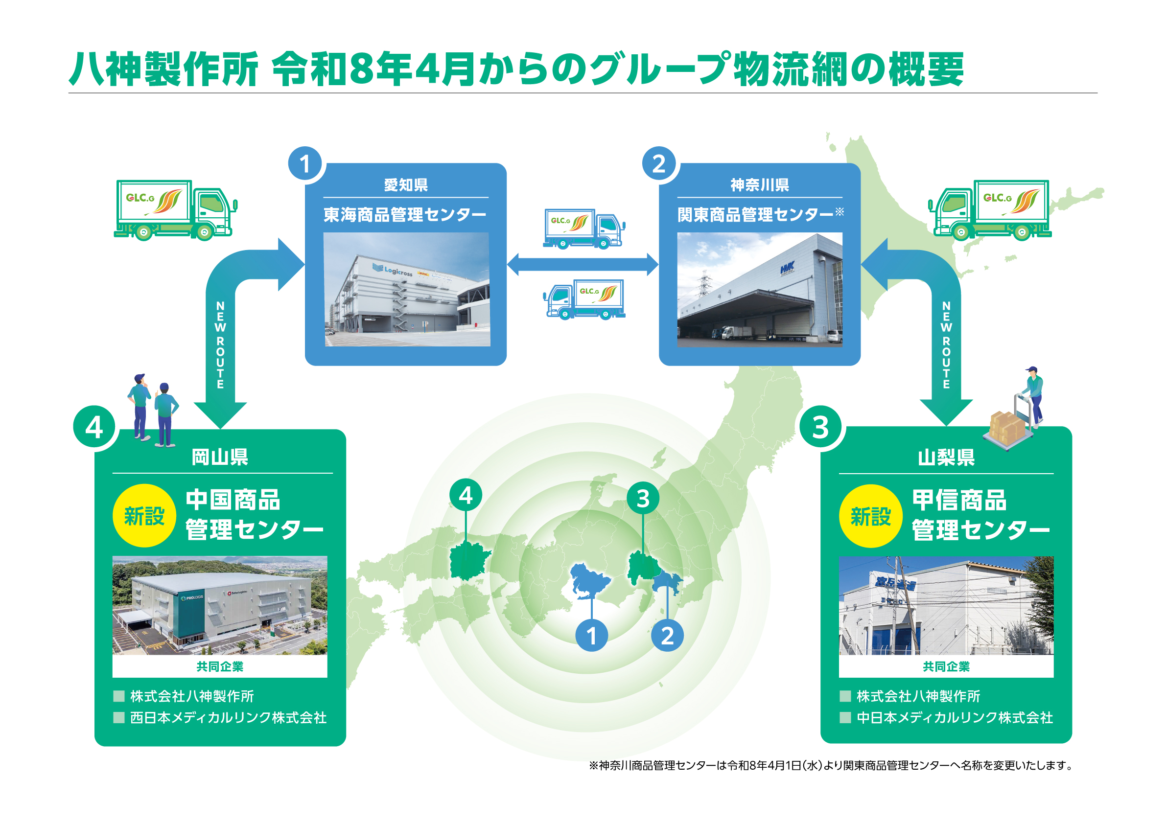株式会社八神製作所(本社:愛知県名古屋市中区、代表取締役社長:荒木 篤志、以下「当社」)は、セイエイ・エル・サンテ ホールディング株式会社を親会社とする「セイエイグループ」の一員として、グループにおける物流サービスの品質向上と、得意先様および仕入先様を含めたサプライチェーン全体の最適化を目的として、下記のとおり「甲信商品管理センター」ならびに「中国商品管理センター」を開設します。