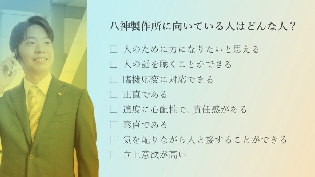 いかがでしたか。八神製作所にどんな人が向いているか、そしてそれがどんな仕事場面で発揮されるか、想像して頂けましたか。
