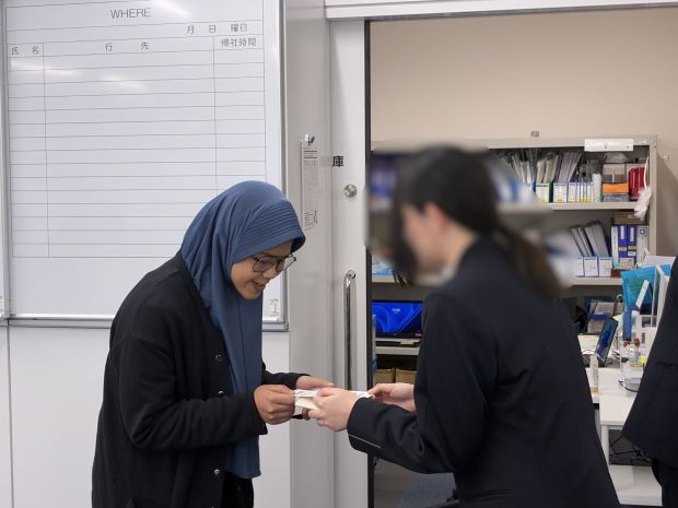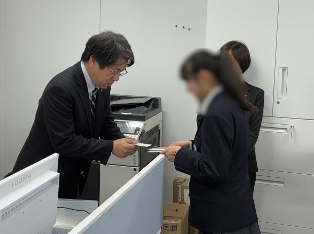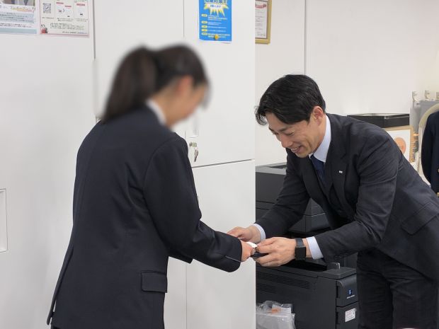 昨年に続き今年も2年生の生徒さん3名にお越しいただき、社会人の基本である名刺交換からスタート。最初は緊張した様子でしたが、さまざまな部署を回りながら社員と何度も実践するうちに、社員顔負けの丁寧な名刺交換ができるようになりました。