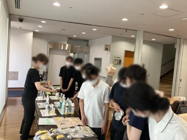 まず、各種ストーマ用装具、剥離剤等のサンプルをお一人ずつに配布して説明を行いました。