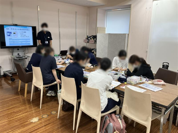 講義のあとは、実際に在宅医療機器の操作体験を行い、皆さま初めて手に取る機器を興味深く観察されて、使用方法の説明を真剣に聞いているご様子でした。