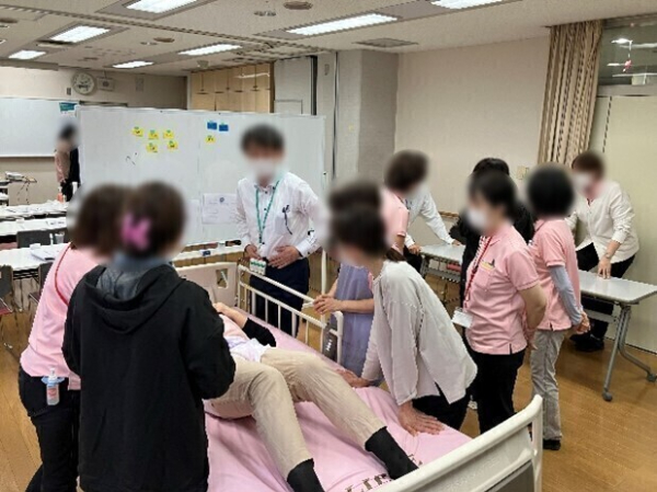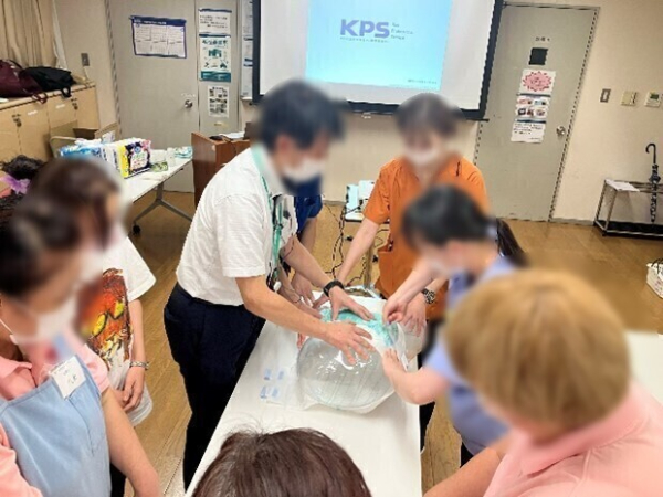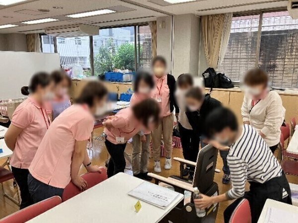 花王プロフェッショナル・サービス株式会社様によるおむつのあて方のコツでは、講義を振り返りながらお一人ずつあて方を実践。